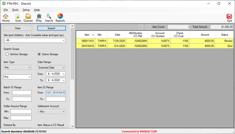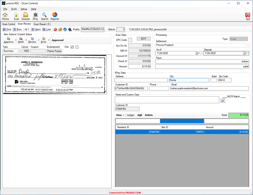 - Check Review – The Check Review tab displays all of the transactions created from the Desktop Check Scanner.