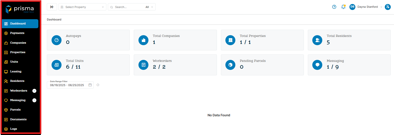 The left navigation panel is the hub of the Prisma Manager portal. Depending on your company’s settings and the specific property you’re assigned to, your screen may look a little different or some features may not be available to you.