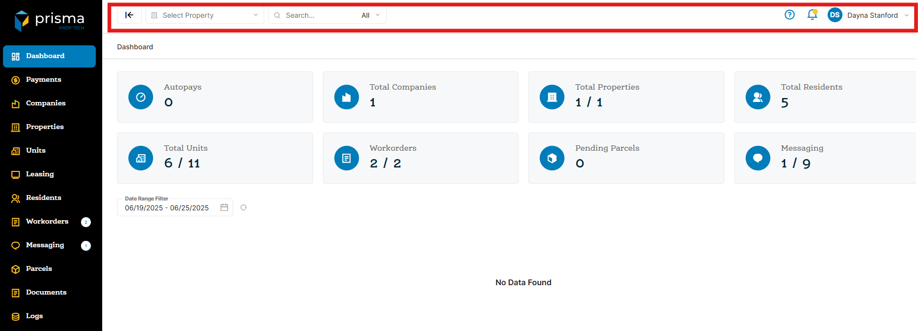 The top navigation bar allows you to quickly filter by a specific property, if you manage more than one, quickly search with Prisma, access the knowledge base and manage your profile.