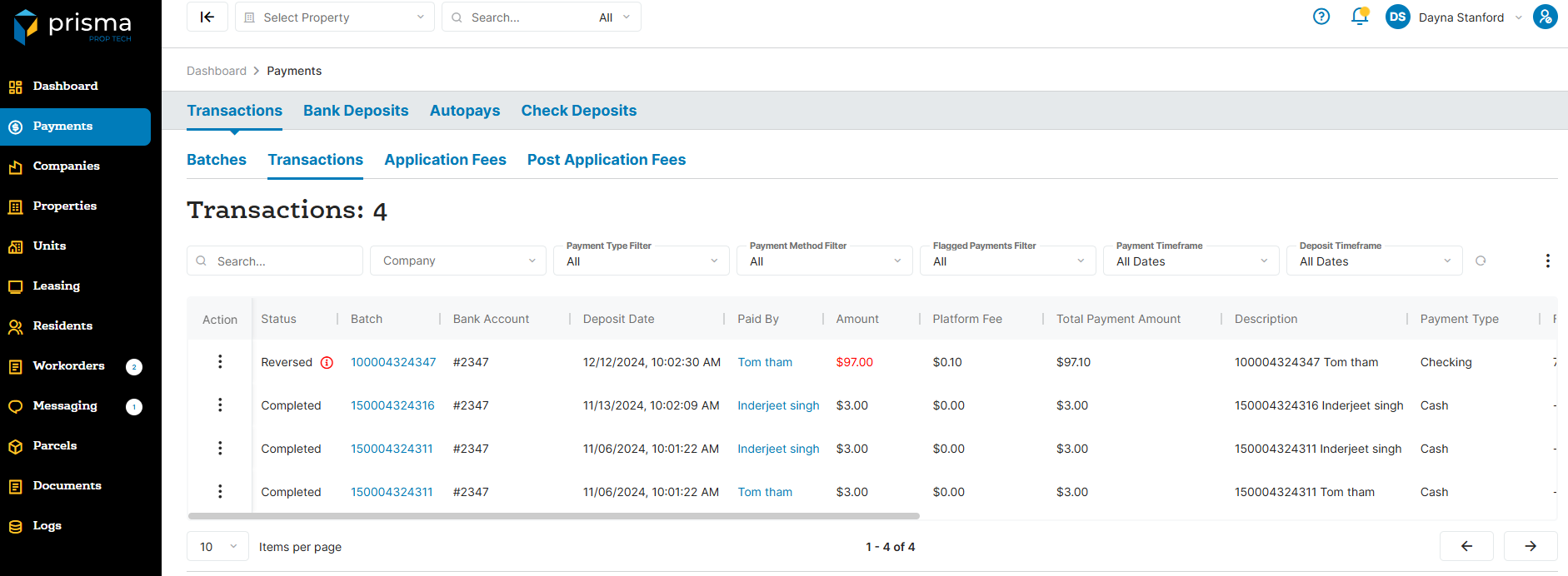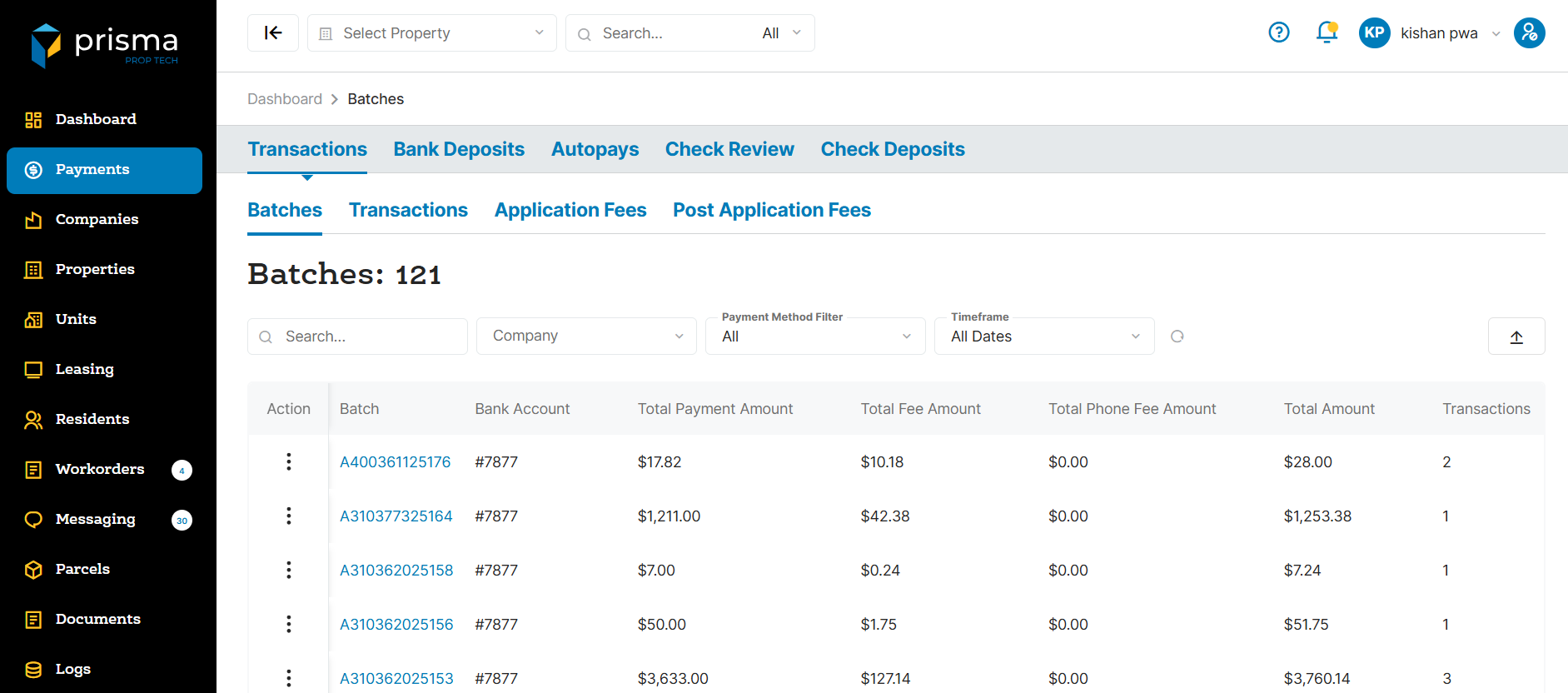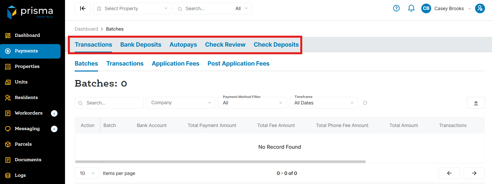 - Payments – The Payments section gives you access to Transactions, Bank Deposits, Autopays, Check Reviews, Check Deposits, Batches, Application Fees, and Post Application Fees.