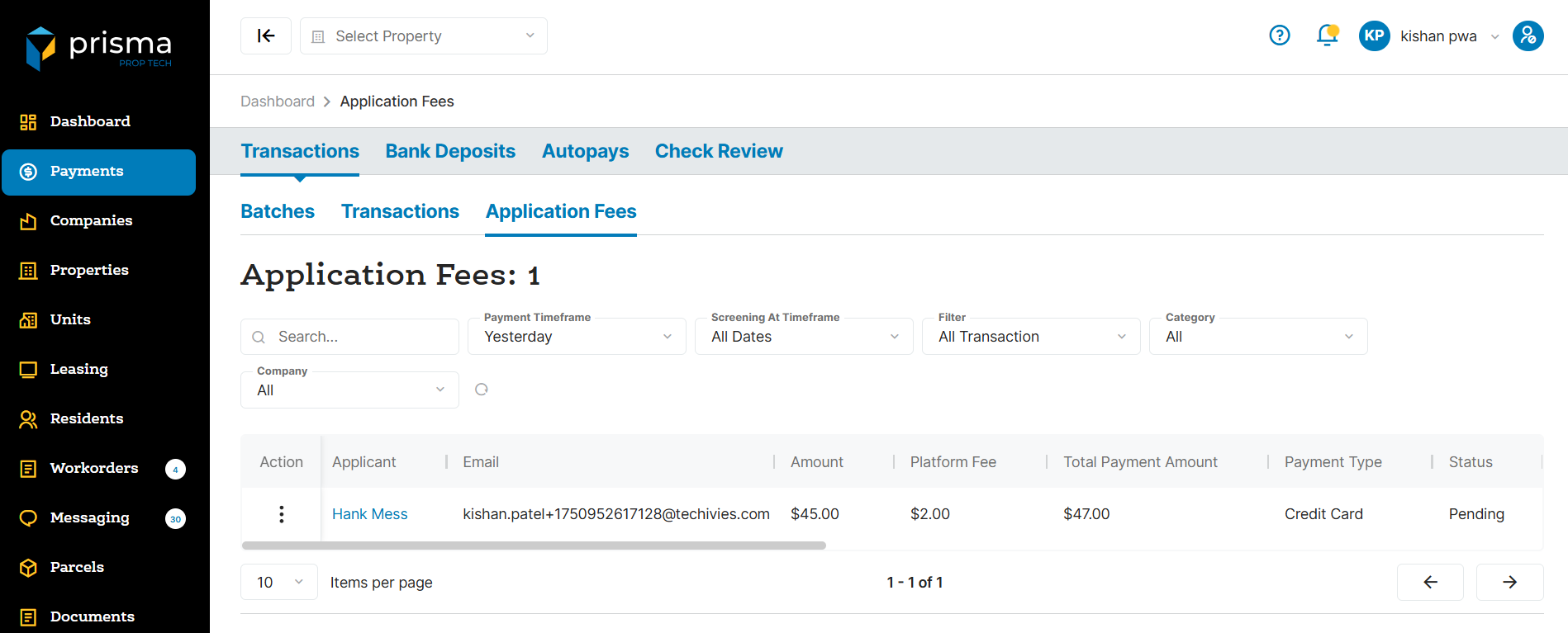 - Application Fees – The Application Fees tab provides a list of all the application fees processed in Prisma.