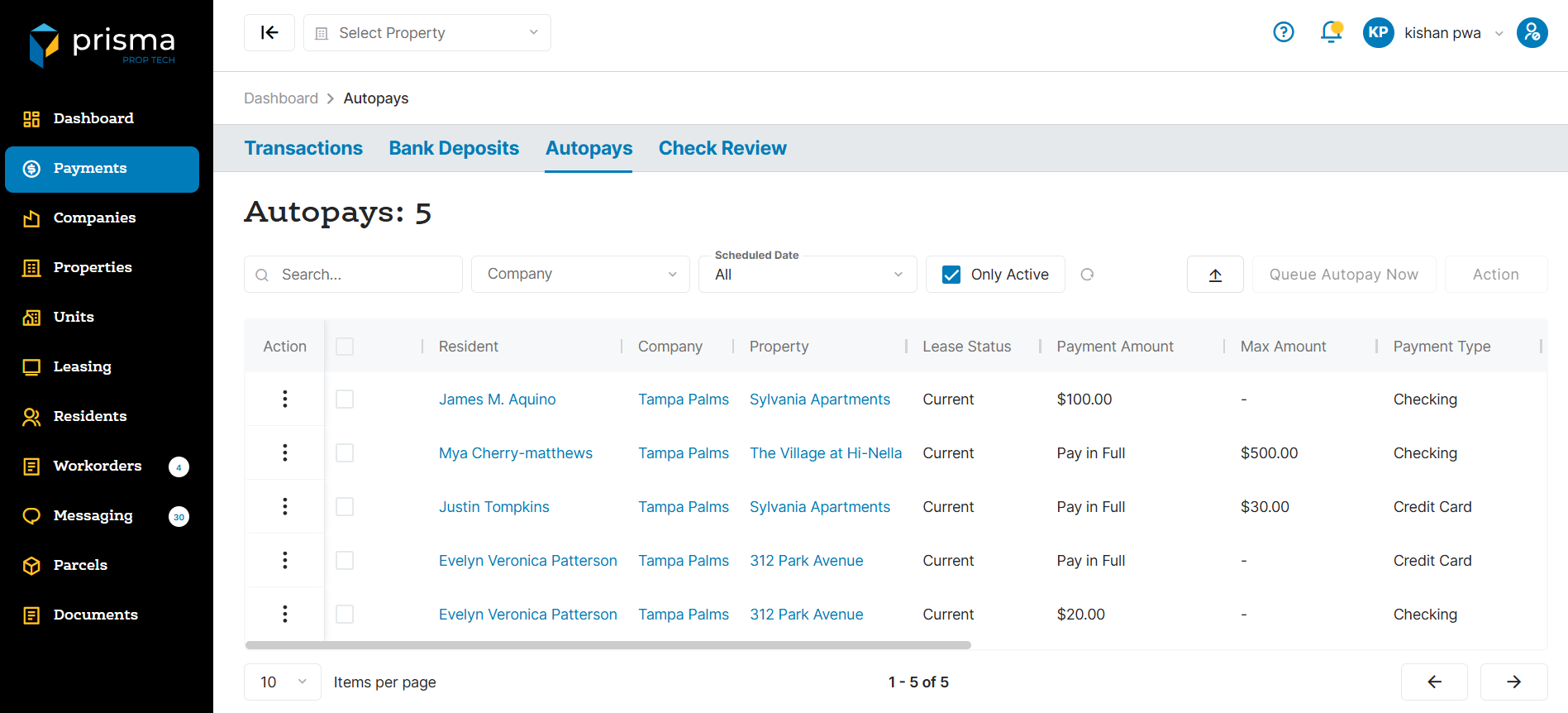 - Autopays – The Autopay Tab displays all of the autopays for your residents.