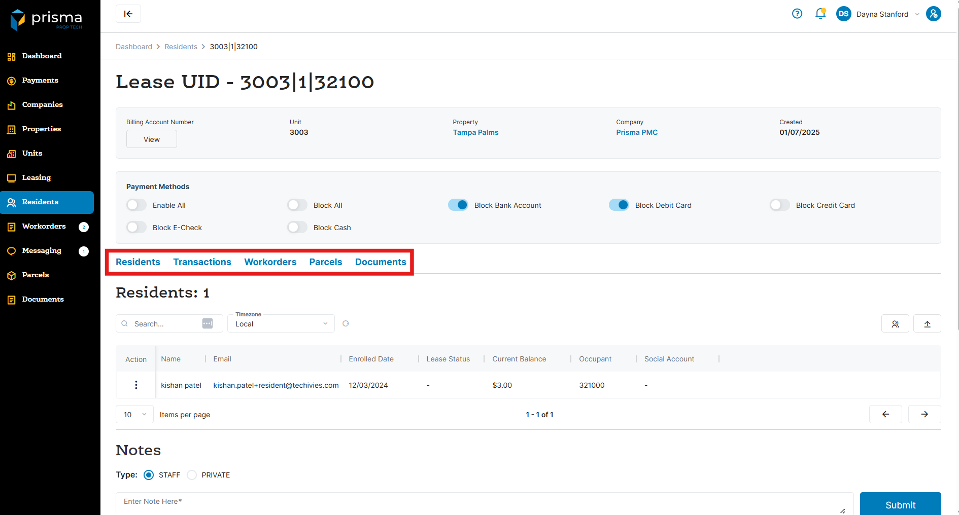 - Lease Detail – View the lease details along with residents associated to that lease, transactions, workoders, parcels and documents.