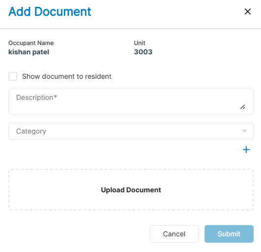 - Add Document – Allows you to add a document and choose if you want it to display in the Resident Portal.