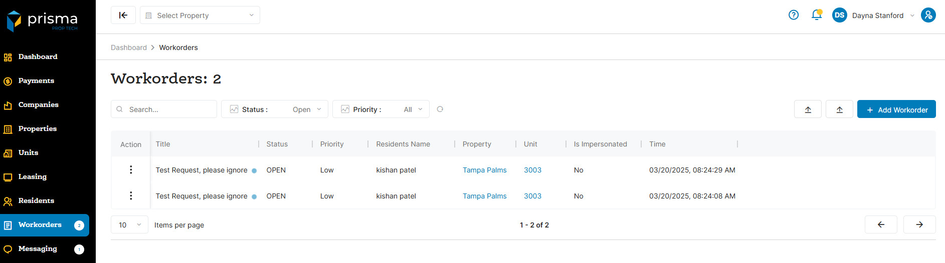 - Workorders – The Workorders section allows you to view all workorders, add and manage all workorders for your property.